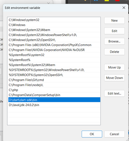 Setelah diekstrak, agar dart dapat dijalankan secara global, tambahkan path pada environment setting.