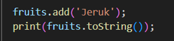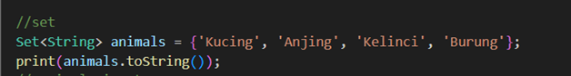 Syntax: Set<TipeData> namaVariabel={}; atau