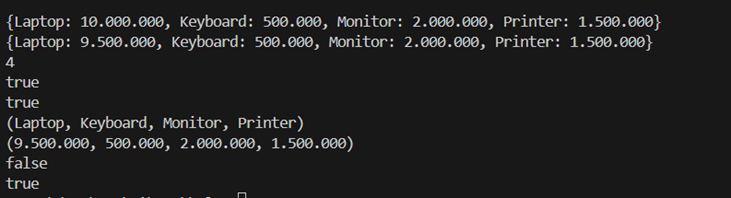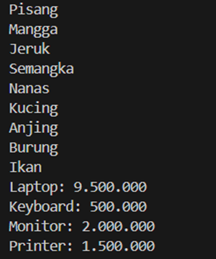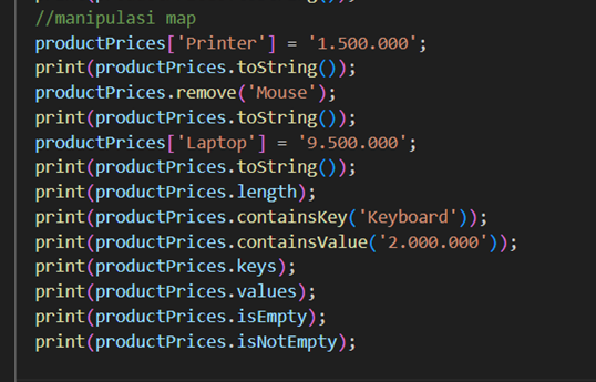 Dibuat map untuk menyimpan data produk dan harganya. Nama produk sebagai key dan harga sebagai valuenya.