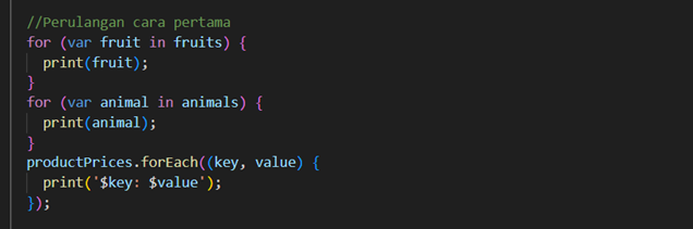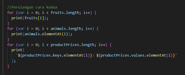 Menggunakan `for-in` dan `forEach` untuk langsung mengambil elemen dari list, set, atau pasangan key-value dari map.