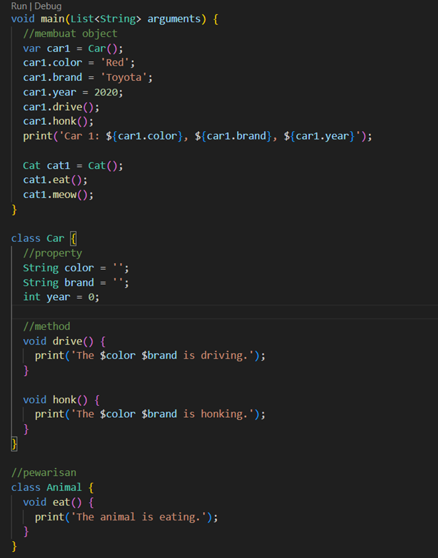 - Data mobil (color, brand, year) ditampilkan dengan `print`.