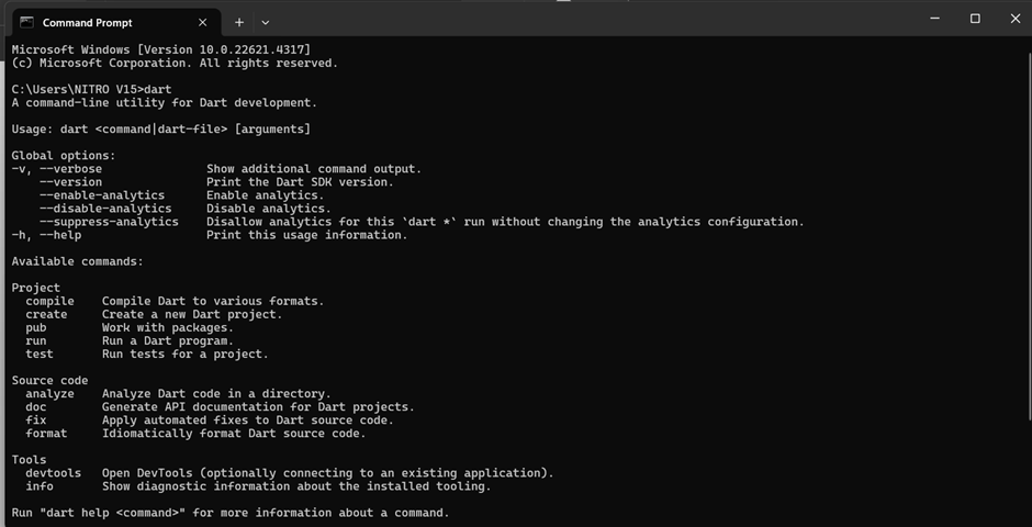 Jika outputnya seperti pada gambar, berarti dart sudah bisa digunakan.