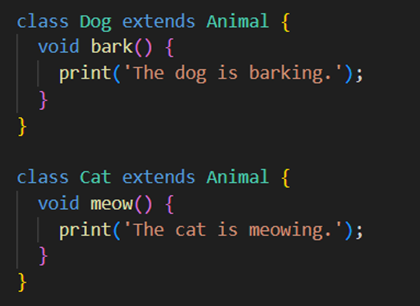 - Class dog dan cat mewarisi atau extend dari class Animal sehingga dog dan cat otomatis punya method eat() dari class animal. Lalu class dog menambahkan method bark dan class cat menambahkan method meow