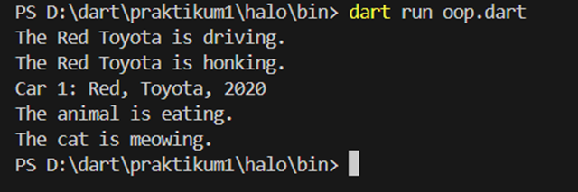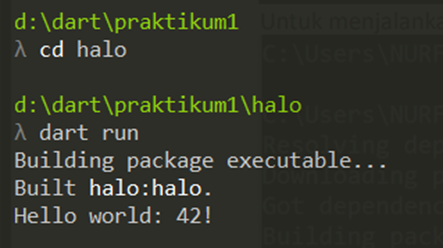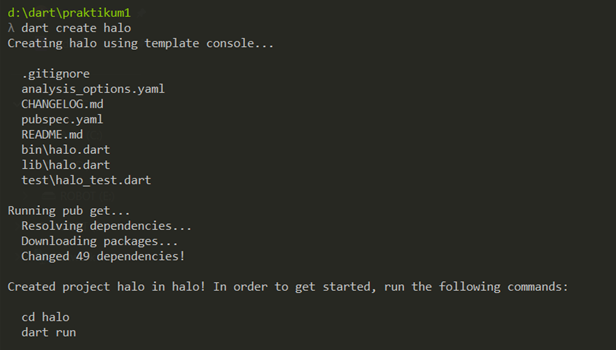Lalu jalankan melalui terminal dengan ketikkan dart run bin\dart_dasar.dart