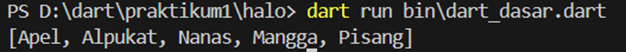Atau bisa juga masuk ke folder bin terlabih dahulu dengan cd bin, lalu ketikkan dart run dart_dasar.dart.