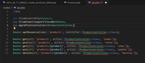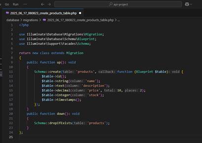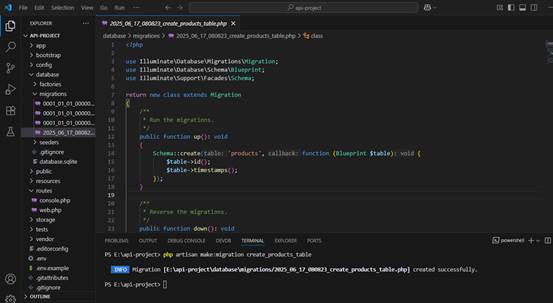 Selanjutnya adalah menyiapkan database. Buka folder project di vscode atau code editor lainnya. Lalu buka terminal dan masukkan perintah php artisan make:migration create_products_table untuk membuat table migrasi. Jika sudah maka akan terbuat file database\migrations\2025_06_17_080823_create_products_table.php.