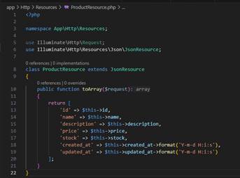 File resource akan berada pada // app/Http/Resources/ProductResource.php. Lalu sesuaikan file: