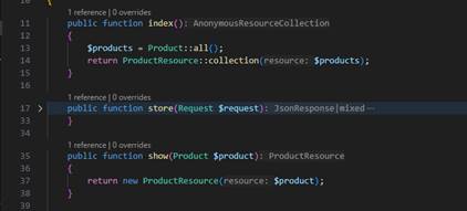 Ubah method index dan show menggunakan API Resource pada ProductController.php dan jangan lupa untuk import ProductResource menggunakan use.