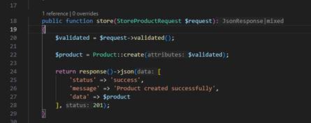 Implementasikan pada Method Store di file Product Controller dan jangan lupa untuk import StoreProductRequest.phpnya