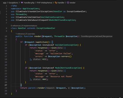 Buat folder baru yaitu folder Exceptions di dalam folder app dan tambahkan file Handler.php