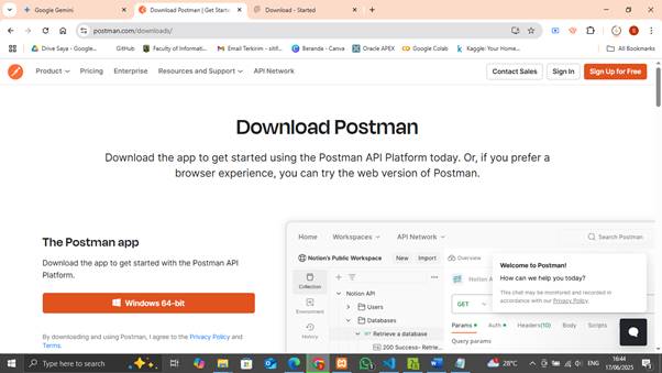 Untuk melakukan pengujian menggunakan POSTMAN, download aplikasinya melalui website resmi POSTMAN dan langsung install